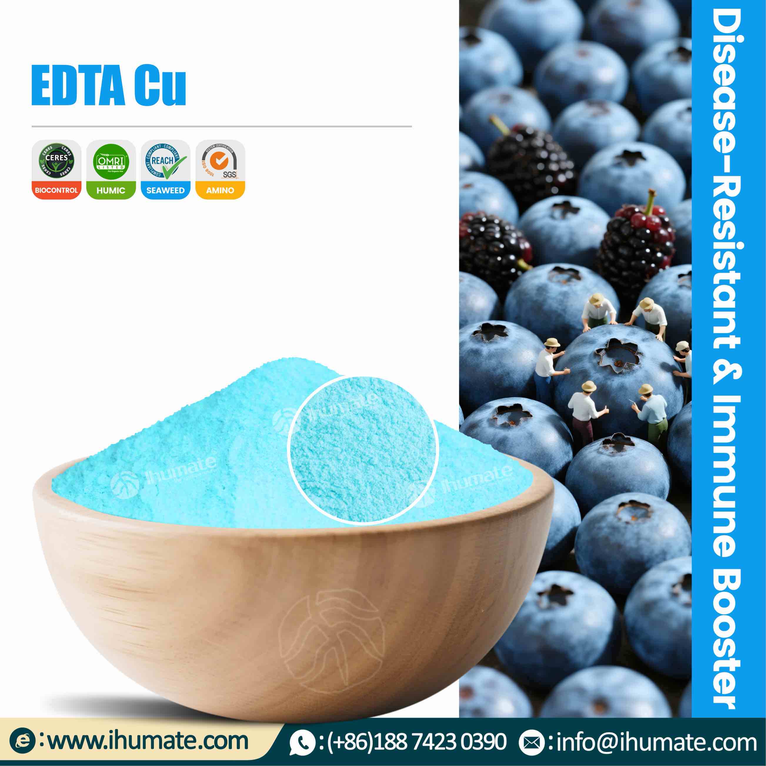 EDTA chelated copper (Cu 14.7%, core advantage) features a chelation rate of ≥98%, neutral pH 6.54, and 200-mesh blue powder. Relying on a stable chelate structure, it achieves deep synergy of "high-capacity copper retention + stable neutral efficacy + enzyme-activated disease resistance", avoiding the disadvantage of ordinary copper fertilizers being easily fixed by soil colloids. It integrates multiple functions: fast copper supplementation, nutrient deficiency correction, enzyme activity activation, and enhanced disease resistance. Suitable for various crops, especially copper-sensitive ones, it is the preferred product for efficient copper supplementation, quality improvement and disease prevention.